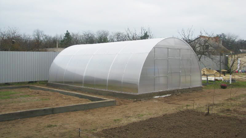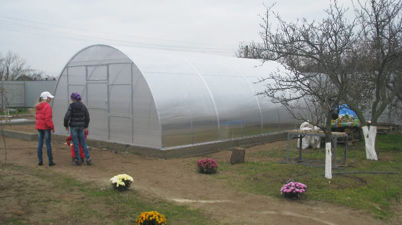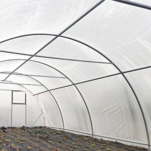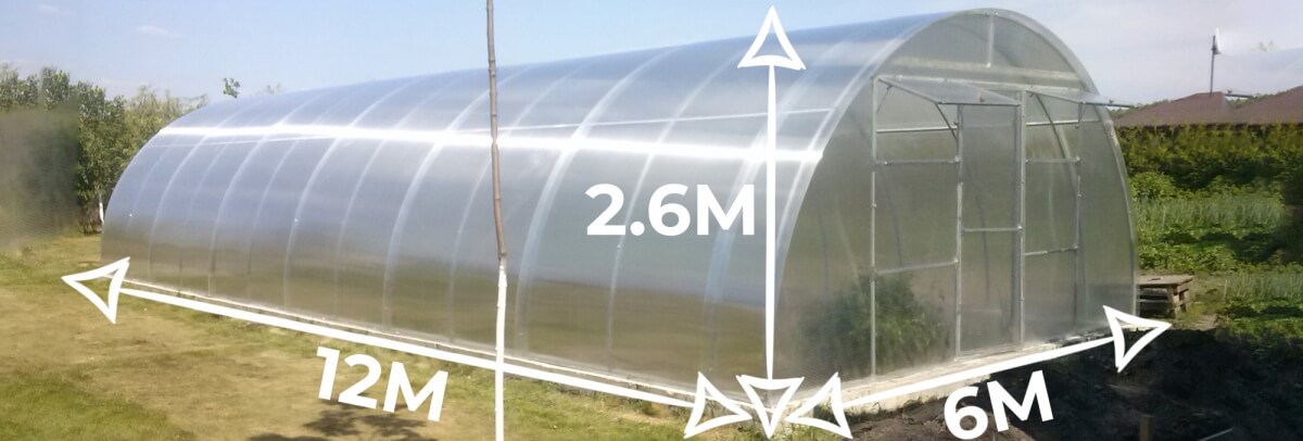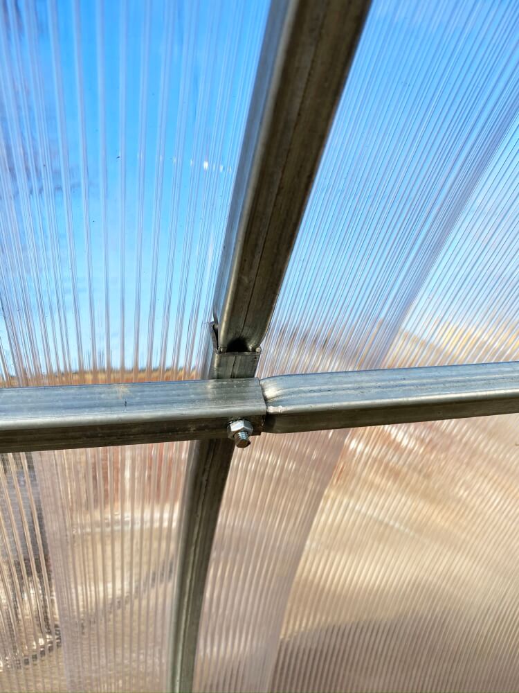 Poliwęglan wysokiej jakościGrubość poliwęglanu wynosi 4, 6 lub 8 mm, termin eksploatacji jest od 8 do 10 lat w zależności od warunków pogodowych i nie trzeba go zdejmować pod czas okresu zimowego. Posiada odporność na promienie UV4. Mocuje się do stelażu na zakładkę 5 cm (inne 5 cm wystają nad szczytami tunelu dla przykrycia pionowych płyt poliwęglanu z przodu i z tyłu) przy pomocy wkrętów samowiercących. |