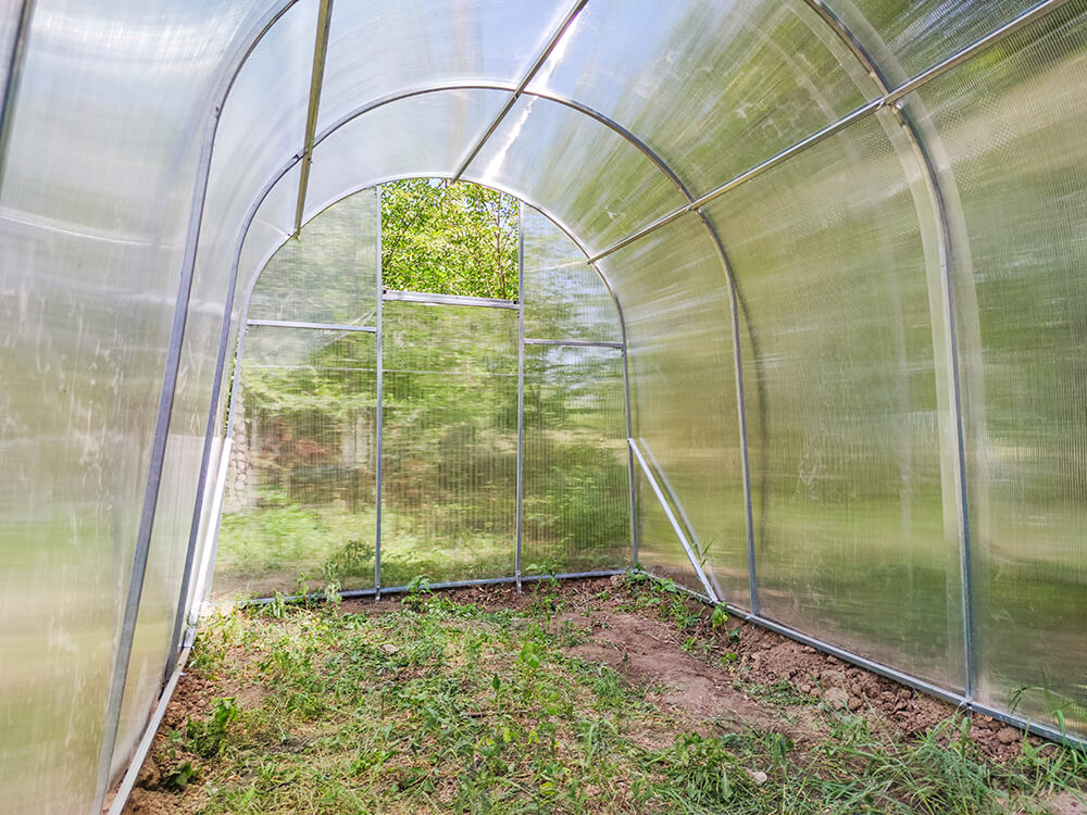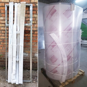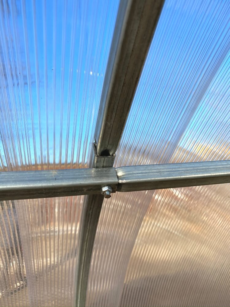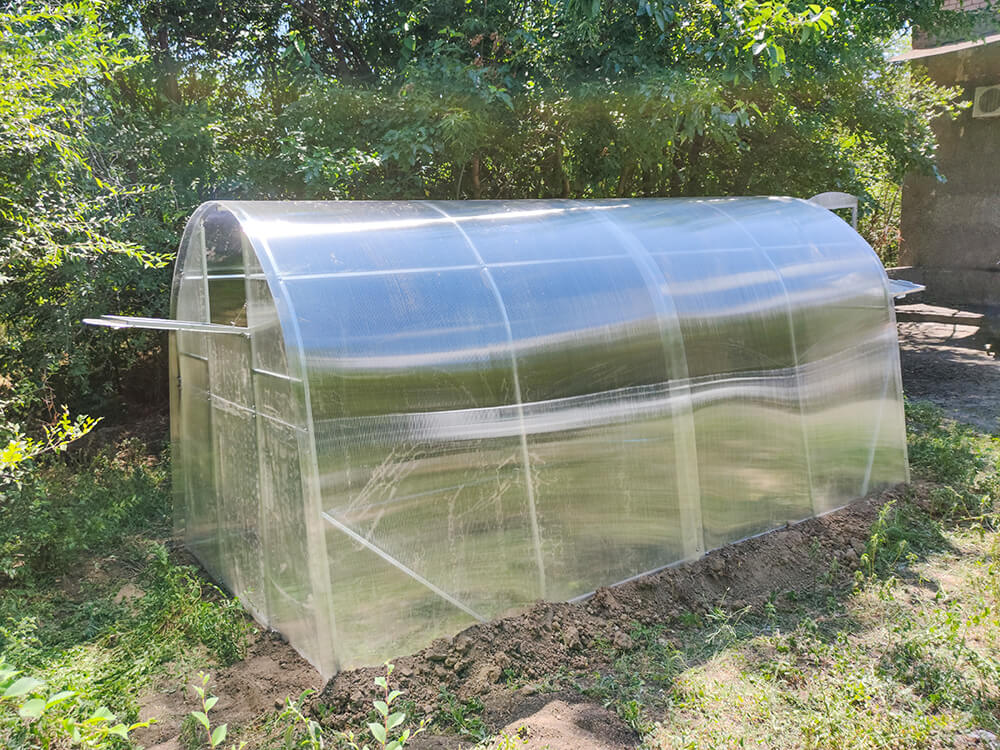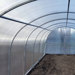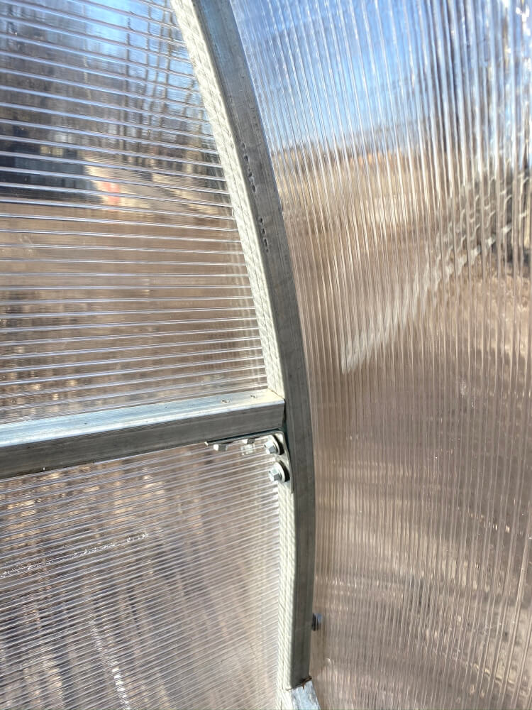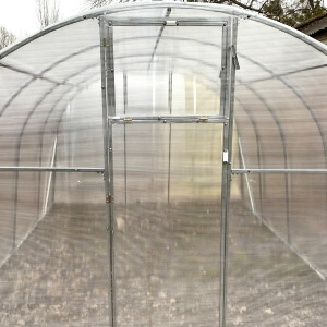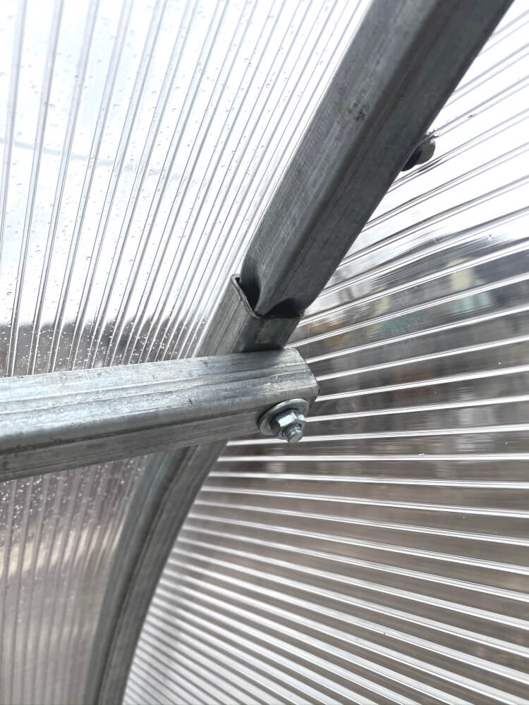 Poliwęglan wysokiej jakościGrubość poliwęglanu wynosi 3, 4 lub 6 mm, termin eksploatacji jest od 8 do 10 lat w zależności od warunków pogodowych i nie trzeba go zdejmować pod czas okresu zimowego. Posiada odporność na promienie UV4. Mocuje się do stelażu na zakładkę 5 cm (inne 5 cm wystają nad szczytami tunelu dla przykrycia pionowych płyt poliwęglanu z przodu i z tyłu) przy pomocy wkrętów samowiercących. |